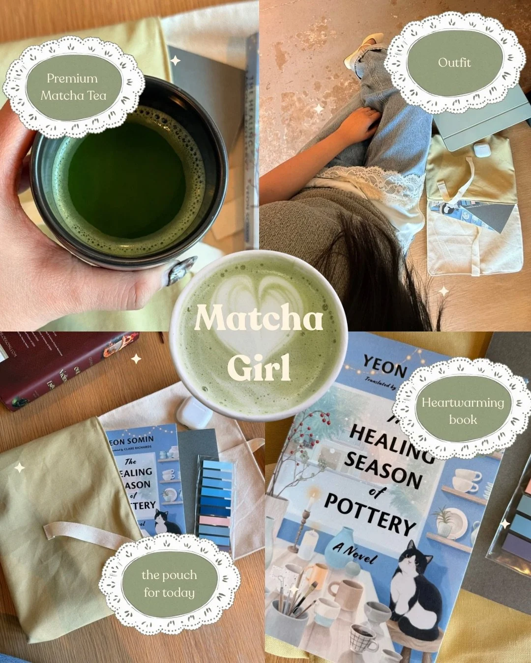 For the third day, we have the infamous matcha, my favourite out of the four. Matcha has taken over, and you see it fused with everything: ice cream, cakes, drinks, various other desserts, and even butter. As a matcha girl, most are aesthetic-driven, intentional in daily aspects, and calm. All things considered, I’d like to think I am one of them. However, how the people I align myself closest with would beg to differ… if given the chance to answer such a daunting question as to what type of person I truly am. I decided to pull from a simple and delicate yet transformative styling choice, layering. Lately, a very trendy thing these days is to level up an outfit by layering a lace cami under sweaters or cardigans. As my “matcha-forward” clothing is limited, I managed to find something that’s worth the 300 inspirational pins on my Pinterest board. This day is topped off by my daily dose of matcha from my top choice cafe, Common Ground Coffee. Because where else would I be? For my choice of literature, I found it very difficult to choose one that spoke of MATCHA. I landed on one of many heartwarming books called A Healing Season of Pottery. This book is perfect for the current weather that’s decided to plague my surroundings for the last few months. As I take a sip of my hot matcha latte, I’ll continue to flip through the pages, and hopefully, I’ll find myself calm and ready for the obstacles to come.