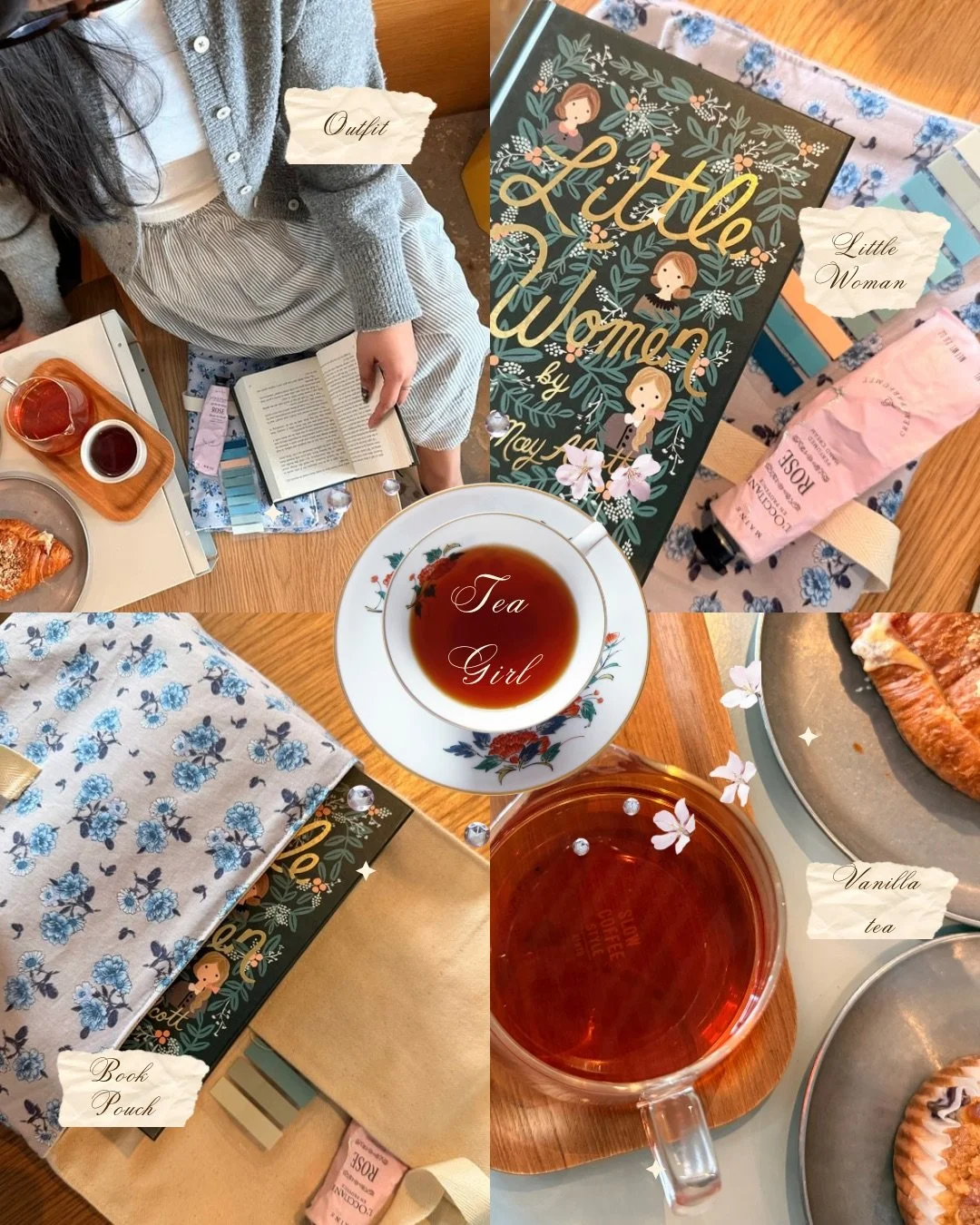 Tea, is that the recent gossip that your asian auntie is dying to tell you at bingo or that warm beverage that combats the insistent migraine that tags along as I navigate the inconsistencies of my schedule. As much as I want to tell you it's the first one, we are here to talk about the healing powers of tea. As a tea it girl, you tend to be mindful, calm, and live a chaotically artistic yet slow-paced life. Now, like tea, you can take that statement with a spoonful of salt, well, sugar actually… As it might not be 100% accurate. But for as long as the steam from that cup of herbal essence rises, you can steep in that bliss. For day two, I wanted this outfit to give spring and light-hearted waves. A brand I gravitated toward was Muji, which is where my skirt is from. Keeping it simple I paired it with a cardigan and a classic white top that I’m pretty sure everyone has. Tea does make me feel like a fancy girl living in Europe as I gaze up at the sunrise upon the horizon from my Victorian-esque balcony. I decided that a book from the classics was the right choice, therefore little women was on the chopping block. As for location, I drove a mere 12 minutes to my favourite cafe, but not for matcha this time, oh no, but for a delicate cup of herbal goodness. Thank you to Common Ground Cafe for providing a calm, peaceful atmosphere as I sip my tea and try to conquer a book so thick my hand has begun to cramp.